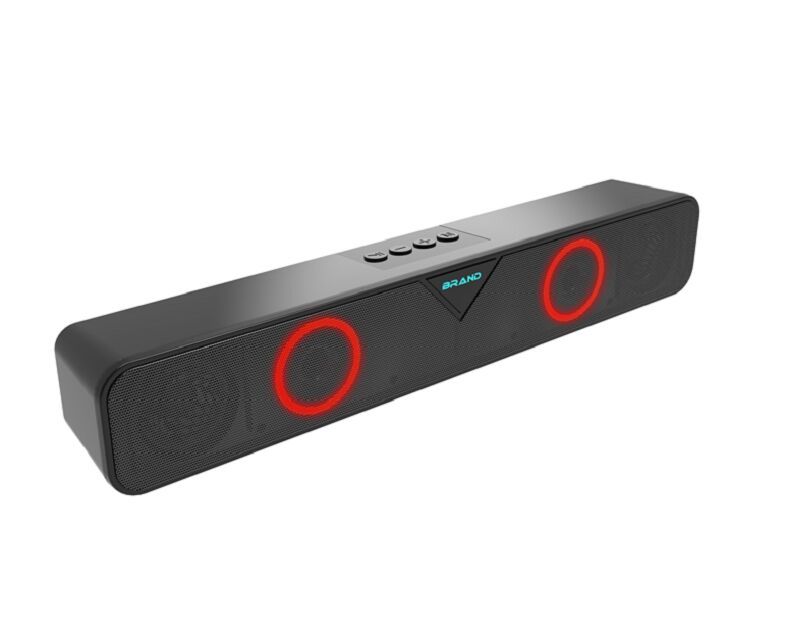Barre de son compacte et lumineuse avec deux pilotes de 2 pouces (5W × 2 RMS) et deux bouches d'aération de basses pour une réponse améliorée.35 Hz~16 kHz avec séparation de canaux > 88 dB pour une image stéréo claireCette barre de son lumineuse, dotée d'une batterie rechargeable de 1200 mAh (entrée DC 5V), permet une lecture sans fil pendant 3 ̊5 heures.Carte TFCette barre de son lumineuse, le panneau de maillage de fer avant et le logo émettent une lumière ambiante RVB personnalisable pendant le fonctionnement.Taille élégante (381×83×78mm) s'adapte parfaitement sous les moniteurs ou sur les ordinateurs de bureau, films, musique, et comme cadeau élégant.